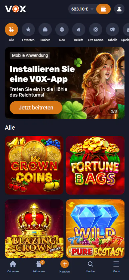 Die Registrierung in der Vox App dauert weniger als eine Minute. Nach Abschluss erhalten Spieler Zugriff auf über 5000 Slots, Live‑Casino‑Tische, Crash Games und Jackpot‑Titel. Die Auszahlungsraten (RTP) sind identisch mit denen der Desktop‑Version. Die Steuerung ist vollständig touch‑optimiert und funktioniert sowohl im Hoch‑ als auch im Querformat. Die Vox App herunterladen ermöglicht somit ein unverändertes Spielerlebnis – unabhängig vom Endgerät.